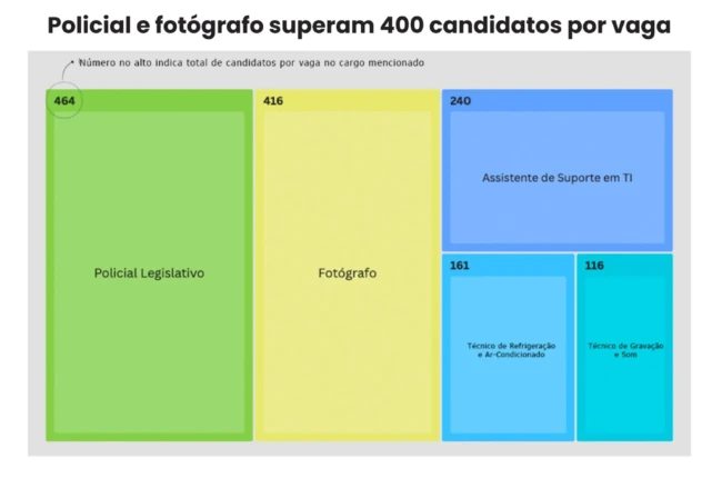 Os cargos mais concorridos, depois da categoria analista administrativo, são de nível médio – o de policial legislativo, com 464 inscritos para cada vaga (18.573 concorrentes para 40 vagas), e o de fotógrafo, com uma disputa de 416 por um (831 inscritos para duas vagas).