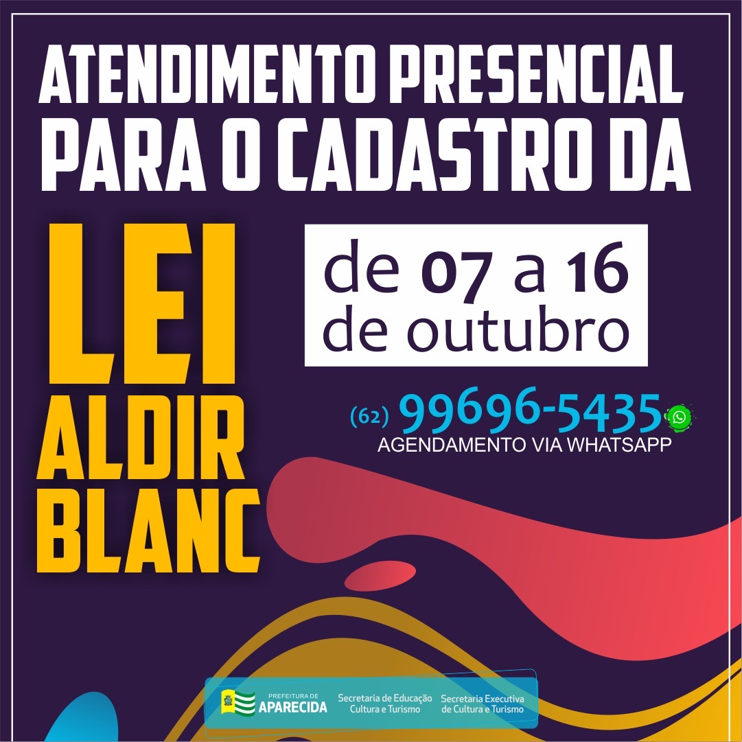A Prefeitura de Aparecida de Goiânia, por meio da Secretaria de Educação, Cultura e Turismo, faz um alerta a todos os fazedores de cultura do município para o prazo de inscrição na Lei de Emergência Cultural Aldir Blanc. A Lei, que homenageia o cantor e compositor brasileiro Aldir Blanc, falecido em decorrência da Covid-19, prevê renda emergencial para trabalhadores da cultura, apoio mensal aos espaços culturais que estão impedidos de realizar atividades presenciais devido a pandemia do novo Coronavírus, e recursos para editais de fomento a projetos culturais.